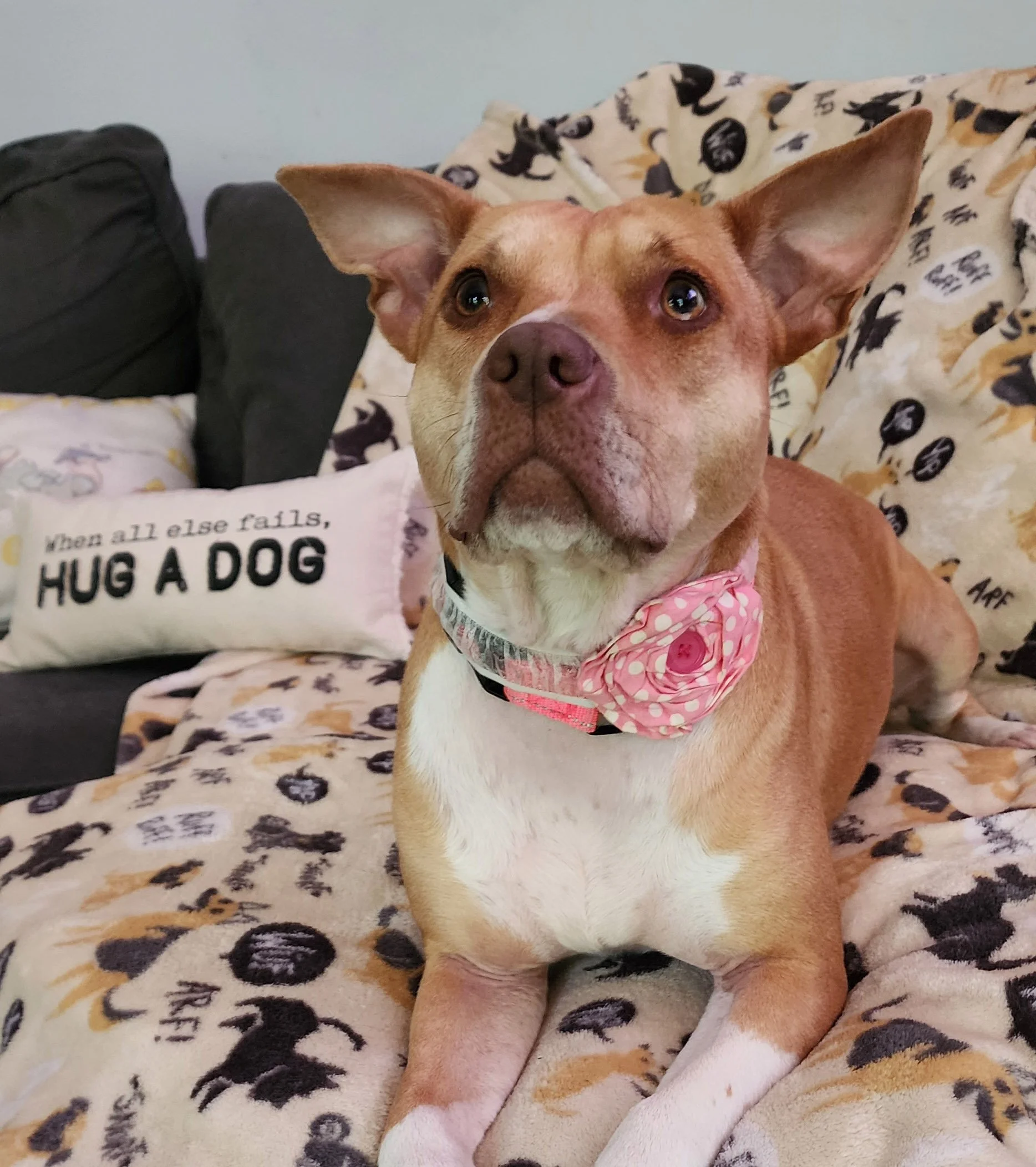 Sassy needs an adopter who will be patient and unafraid of her sassiness. Someone who can calmly lead her to a more peaceful future. It is clear she was mistreated and/or misunderstood by her previous companions. She has some bad habits, like not wanting to share toys with her foster siblings, and begging for food and not wanting to share her view of said food. However, she has made progress here as well! She wants to interact with her foster siblings, and respects them when they want to be left alone. So she could be a good companion for a family with dog/s who are respectful to her space. She could also be very happy being an only dog with a person who will cherish her and hang out on the couch with her and go on strolls.